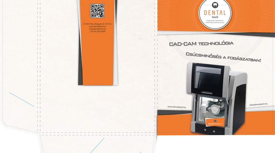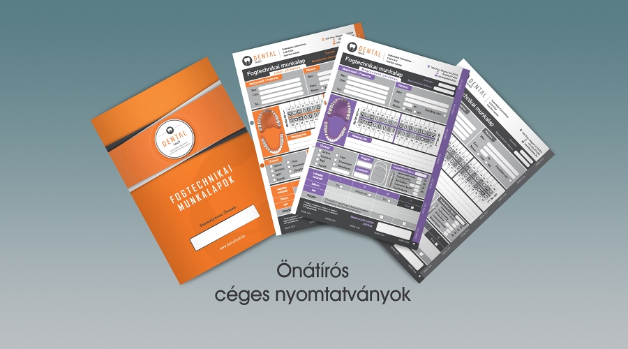 A Dental Tech egy fogtechnikai laboratorium. Arra kértek, hogy tervezzünk számukra dossziékat, pólókat, illetve többpéldányos, tömbösített önátírós munkalapokat mindennapi használatra. A kiindulási alapot a már meglévő weboldaluk adta. A grafikai terveket úgy alakítottuk ki, hogy illeszkedjen a weboldal és a céglogó színvilágához, stílusához.