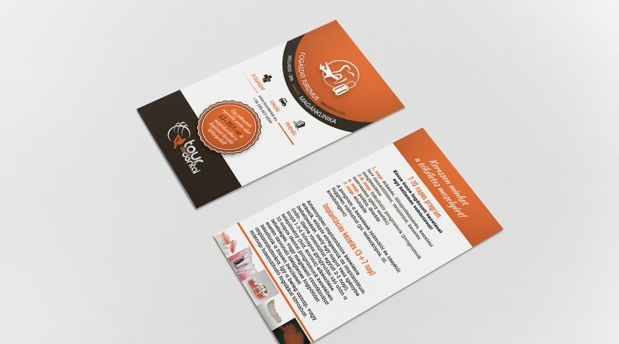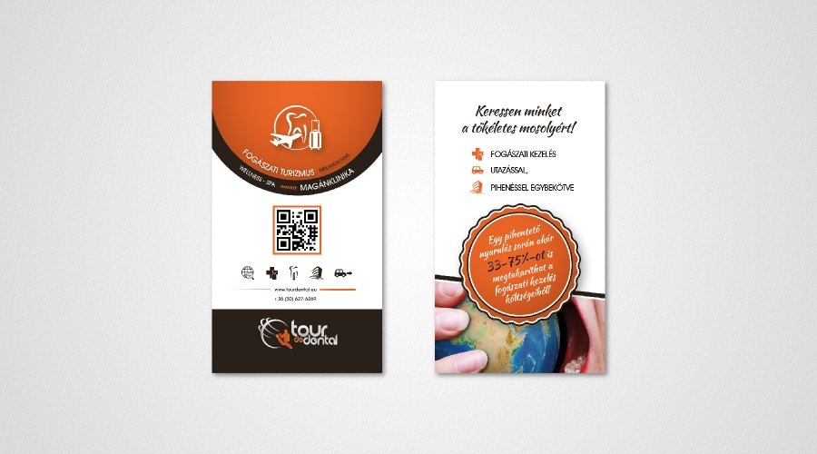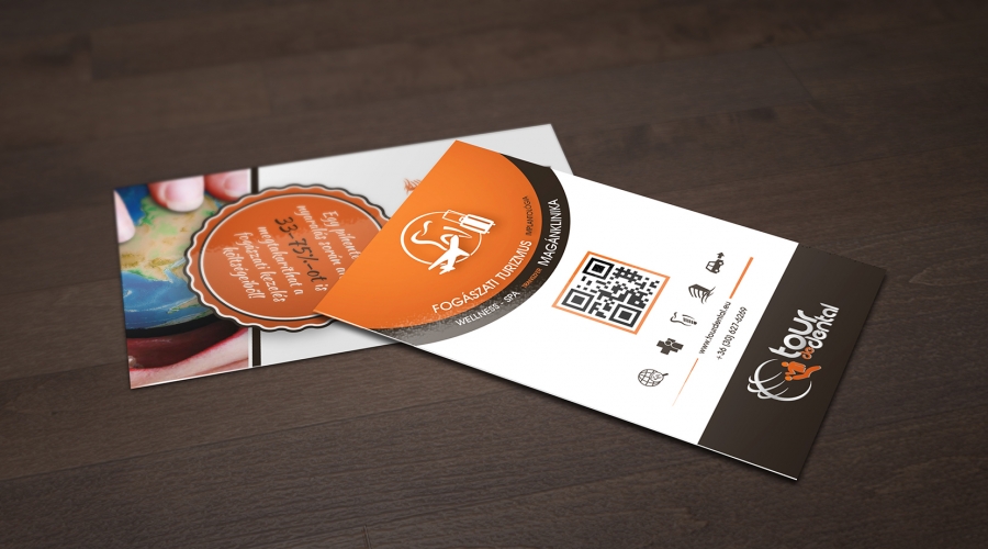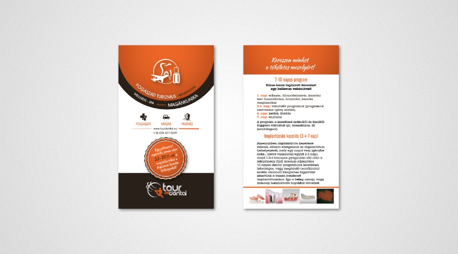 Ez az egyszerű, mégis tartalmas reklámanyag mindössze névjegy méretű. A Tour de Dental Kft. szolgáltatásait tartalmazza. Tervezéskor szempont volt, hogy passzoljon a korábban tervezett arculati elemekhez, mégis figyelemfelkeltő és informatív legyen.